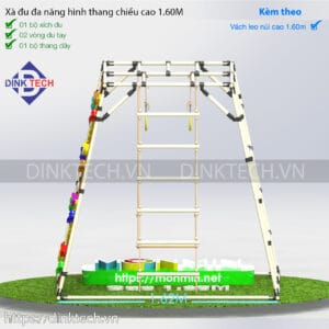 Bao gồm: Bộ khung vận động hình thang + ghế đu gỗ + 2 vòng đu tay + thang dây + Vách leo núi + Tài liệu và dụng cụ tháo lắp